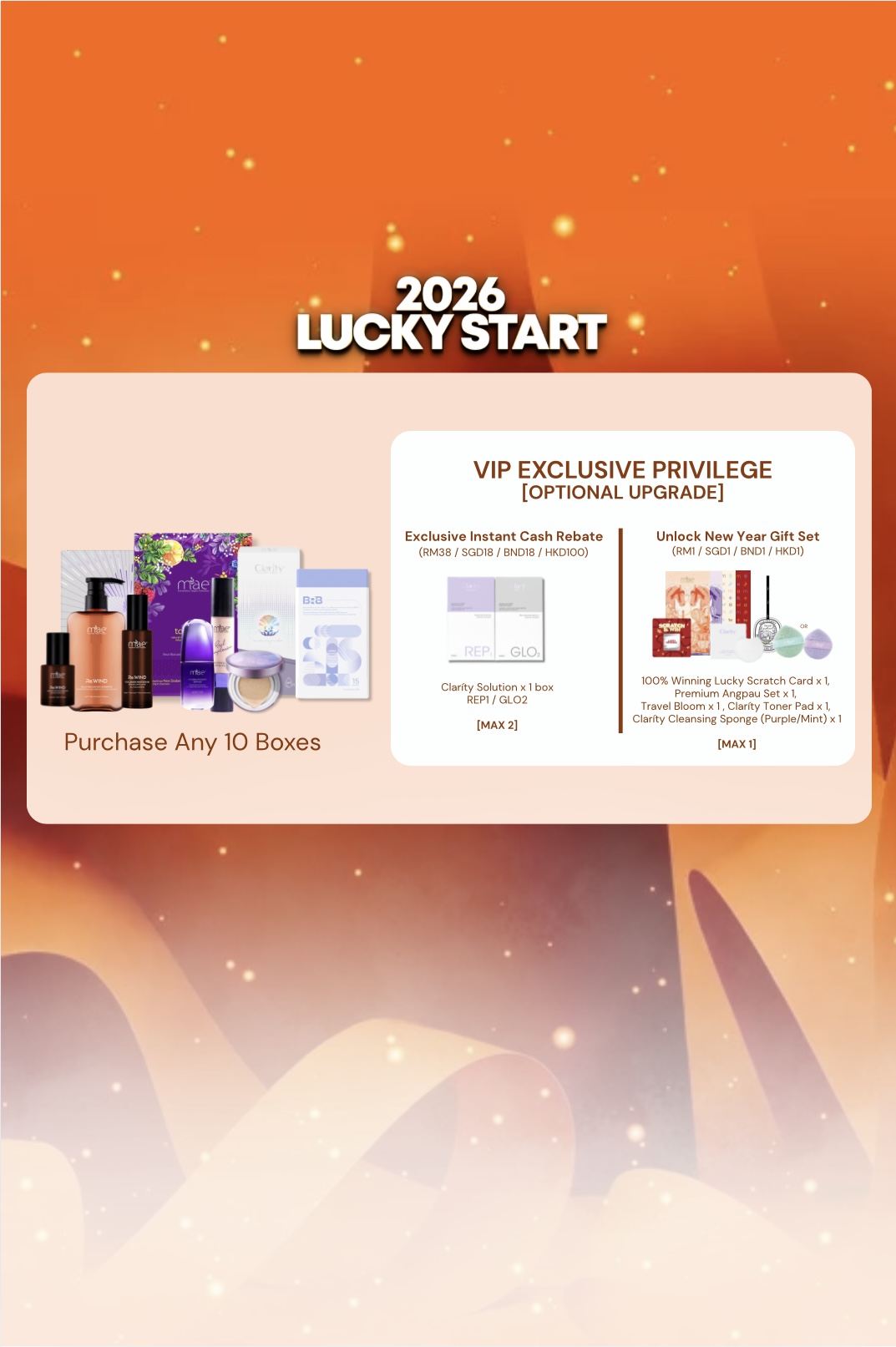 Purchase Any 10 Boxes of MAE Products (MAE Skincare Series | MAE Hair Health Series | MAE Mental Health Series | MAE Eye Health Series | MAE TOTAL DX+) NOW RM1888 | SGD660 | BND610 | HKD4130 (R/P: RM2880 | SGD1120 | BND1140 | HKD6570) 【VIP Exclusive Privilege】 1. Claríty Solution Instant Cash Rebate (Max 2) Claríty Solution (REP1 / GLO2) x1 box → ONLY RM38 / SGD18 / BND18 / HKD100 2. RM1 / SGD1 / BND1 / HKD1 to Unlock New Year Gift Set (Max 1) - 100% Winning Lucky Scratch Card x1 - Premium Angpau Set x1 - Travel Bloom x1 - Claríty Toner Pad x1 - Claríty Cleansing Sponge (Purple/Mint) x1 *colour will be given randomly* 【How To Redeem 100% Winning Lucky Scratch Card Rewards】 a. Make Your Purchase - Only eligible for selected packages with New Year Gift Set upgrade b. Scratch Your Card - Reveal your reward from the Lucky Scratch Card c. Redeem Your Prize - Send your winning screenshot for redemption Remarks: 1. 【2026 NEW YEAR PROMO】 is valid from 1/1/2026, 12PM - 20/1/2026, 11:59PM. 2. Purchase any package of 【2026 NEW YEAR PROMO】 will automatically upgrade the to MAE VIP. 3. The purchase limit for Re.WIND Hair Re-active Essence is 2 boxes. 4. All packages and free gifts are available in limited quantities. First come, first served. While stocks last. 5. All package orders will be shipped within 3–7 working days, depending on order volume and processing sequence. 6. Our company reserves the right to make the final interpretation and amendments of the event rules.